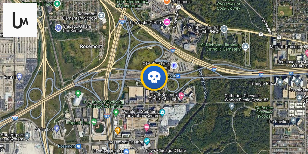 Male (42) stabbed to death, 5801 N River Road Chicago offender in custody, the crime scene is at the CTA Rosemont Blue Line Station
